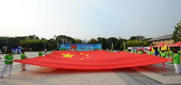 9月29日一早的濱水公園,在8面紅旗和8面麗汽集團(tuán)司旗的簇?fù)硐拢?/span>16名旗手莊重地鋪展開一面巨幅國(guó)旗。早早趕來的麗汽員工和在公園晨練的市民紛紛在國(guó)旗前拍照留念。那一抹鮮艷的中國(guó)紅,映照出的不僅是人們的笑臉,還有所有人心中對(duì)祖國(guó)的依戀。