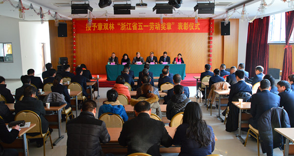 12月24日,授予章雙林“浙江省五一勞動獎?wù)隆北碚么髸邴愃e行,麗水市總工會黨組書記、常務(wù)副主席陳子民、副主席葉云妹、柳愛麗、麗汽集團(tuán)董事長、黨委書記葉茂和章雙林本人出席大會。