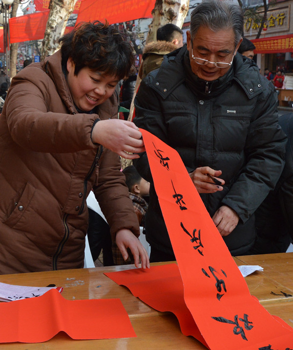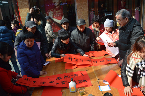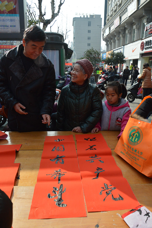 幾張小桌子拼成的簡(jiǎn)易書案更是黨員一條街上靚麗的風(fēng)景。三位老同志一落筆,書案旁邊一下子就圍滿了人,大家一邊排隊(duì)等候著“墨寶”,一邊點(diǎn)贊著三位老師的書法。葉女士高興地說(shuō):“手寫的春聯(lián)不僅更有年味,而且還是在弘揚(yáng)中國(guó)的書法藝術(shù)。中國(guó)傳統(tǒng)的年俗文化,現(xiàn)在已經(jīng)越來(lái)越難得了?!币粚?duì)雙胞胎寶寶的父母恰巧推著嬰兒車從服務(wù)點(diǎn)前經(jīng)過(guò),趕緊請(qǐng)老師寫下“開心寶貝”四個(gè)字,還說(shuō)是給孩子倆最珍貴的新年禮物。