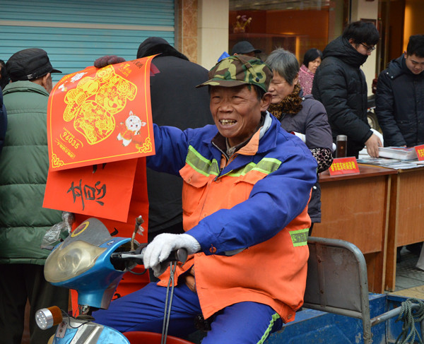 環(huán)衛(wèi)工人接過(guò)麗汽集團(tuán)黨員送上的福字和春聯(lián)臉上樂(lè)開了花
