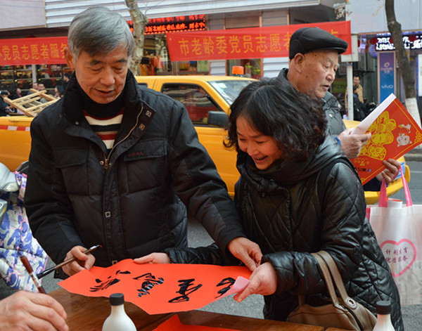 雖然時(shí)節(jié)已過(guò)立春,但農(nóng)歷臘月十九(2月7日)的早上還是寒意逼人,麗汽集團(tuán)的黨員們卻一早就來(lái)到中山街路段,面向廣大群眾展開了春節(jié)班車時(shí)刻咨詢、汽車銷售維修服務(wù)和送春聯(lián)、送福字三項(xiàng)服務(wù)。退休老黨員蘭延生、陳根松、王法根三人更是現(xiàn)場(chǎng)潑墨揮毫,冒著嚴(yán)寒為現(xiàn)場(chǎng)的群眾書寫春聯(lián),送去新春祝福。短短半天時(shí)間里,黨員們共發(fā)放春運(yùn)班車時(shí)刻表、汽車銷售維修資料500份,解答咨詢76人次,贈(zèng)送福字1800張,為群眾現(xiàn)場(chǎng)書寫春聯(lián)450幅,惠及群眾1500人次。