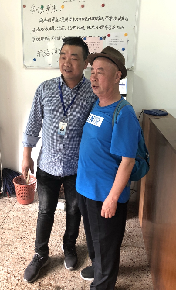 十分鐘后,失主趕到東站調(diào)度室時(shí),正好碰到了準(zhǔn)備發(fā)車的錢偉君師傅,失主王先生一臉感激,連聲向錢師傅道謝并且從錢包里抽出了現(xiàn)金表示要感謝錢師傅,被錢師傅婉言謝絕了。最后王先生堅(jiān)持要和錢師傅合影留念,并熱心地邀請(qǐng)錢師傅抽空一定去北京玩。因?yàn)橥跸壬s下午4時(shí)的高鐵,錢偉君師傅的班車也馬上要出發(fā),他們彼此互留了微信后,就握手道別了。